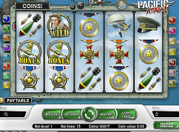Игровой автомат Pacific Attack в считанные секунды перенесет гемблеров в годы Второй мировой войны, чтобы сделать каждого игрока участником воздушного боя. Усевшись за штурвал боевого самолета, любители азартных игр смогут нанести меткие удары по военным кораблям противника с воздуха и стать победителями виртуального сражения.