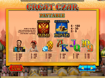 Эмулятор The Great Czar оснащен пятью барабанами с 30-тью линиями. Играть бесплатно геймеры могут, активировав любое количество линий. Для запуска вращений необходимо сделать ставку в диапазоне от одной до пяти монет. Три одинаковых изображения, расположившиеся на активной линии, считаются призовой комбинацией. За такое сочетание начисляются кредиты. Для того чтоб обналичить выигрыш, нужно в азартные игры играть на деньги.