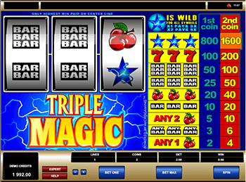 Игровой слот Triple Magic содержит такие символы: вишни, бары трех видов, три семерки, звезды. Отличительной особенностью слот-машины является наличие двух видов монет, номинал которых составляет от 0,25 до 10 кредитов. Минимальную прибыль принесет комбинация из вишен, которая оплачивается с коэффициентом х2 при выпадении одного символа, х5 – при выпадении двух символов и х20 принесут три рядом стоящих изображения. Три одинарных бара оплачиваются с коэффициентом х10, три двойных с х25, три тройных с х50. За комбинацию символов 777 в зависимости от суммы ставки можно получить от 100 до 200 кредитов, Наибольшую прибыль принесет символ три звезды в размере от 800 до 1 600 кредитов! Удачи в игре!